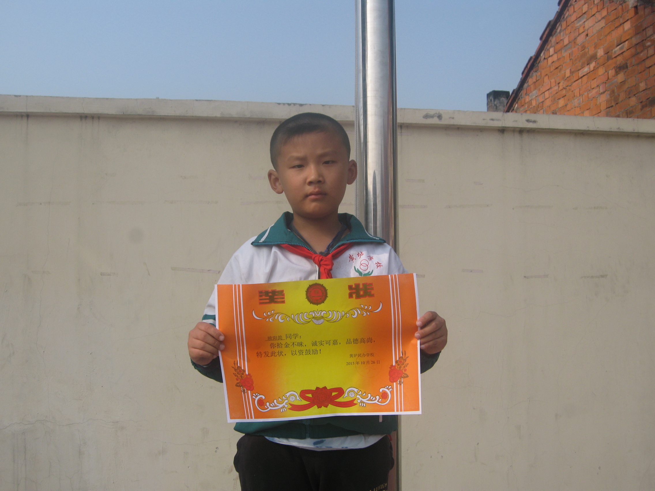 为鼓励这种拾金不昧的精神。我以一面锦旗表示谢意,也希望你的学校同学继续发扬拾金不昧的高尚精神。